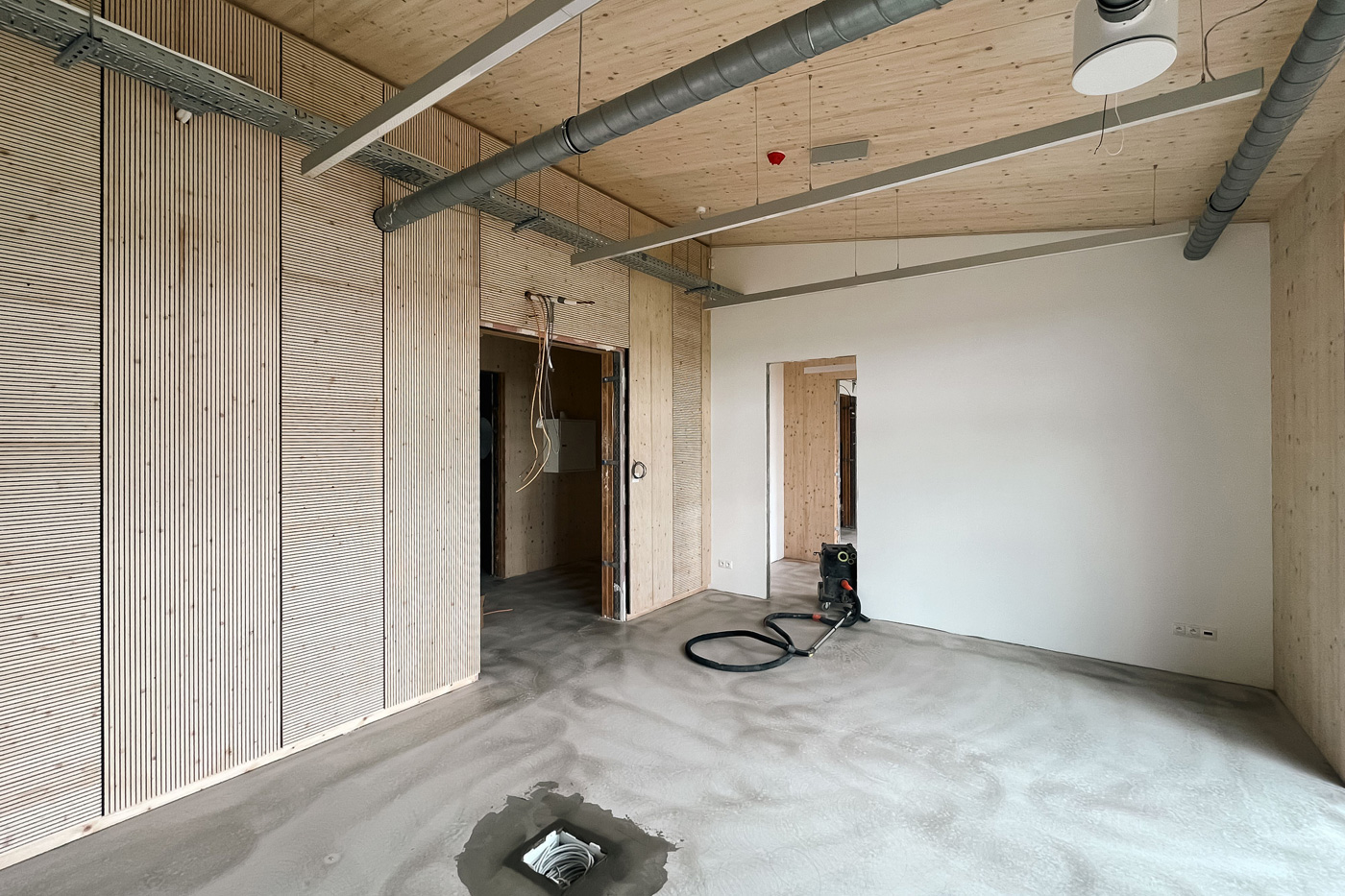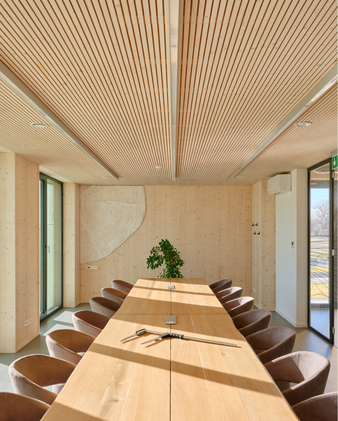 Krížom lepené drevené panely sú v interiéri maximálne exponované, a to vďaka svojej výnimočnej vizuálnej kvalite. Vodorovné časti konštrukcie (strecha a stropy) sú tiež vyrobené z CLT panelov. Drevo v interiéri je príjemným prvkom, ktorý zaisťuje akustický a tepelný komfort. Zároveň prináša estetickú kvalitu, ktorá spolu s množstvom prirodzeného svetla a nábytku vo svetlých tónoch vytvára príjemné pracovné prostredie.