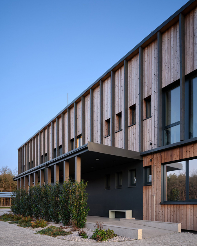 Hlavnou administratívnou budovou je dvojpodlažná drevostavba z CLT panelov