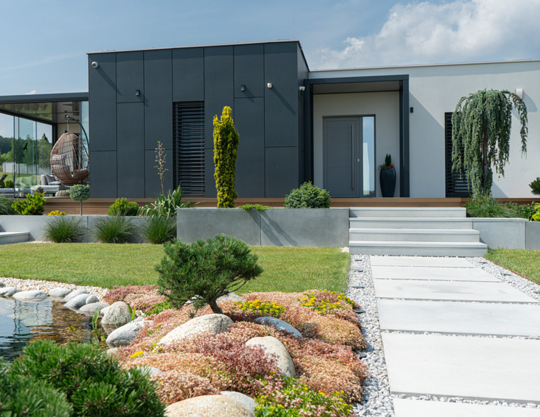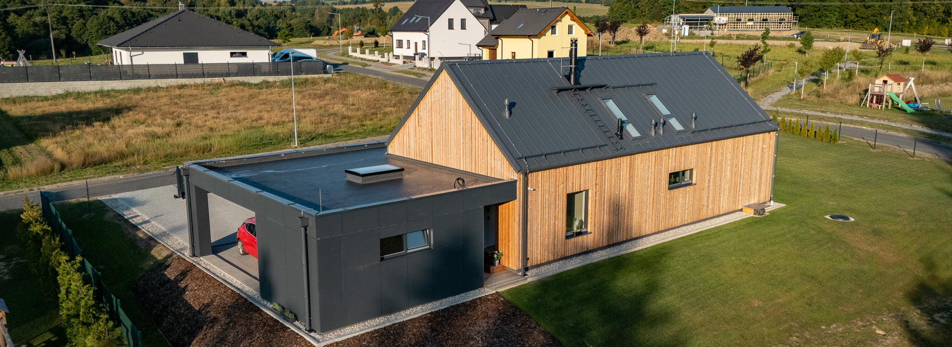 Moderný bungalov v Košiciach kombinuje svetlú omietku a antracitový povrch fasády z obkladu Hardie® Panel.
