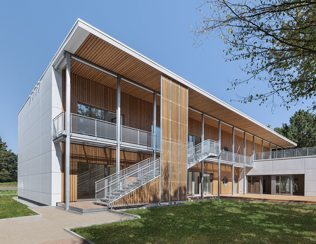 Biele Hardie® Panely na fasáde novej materskej školy detskej skupiny Poníček v Prahe-Suchdole