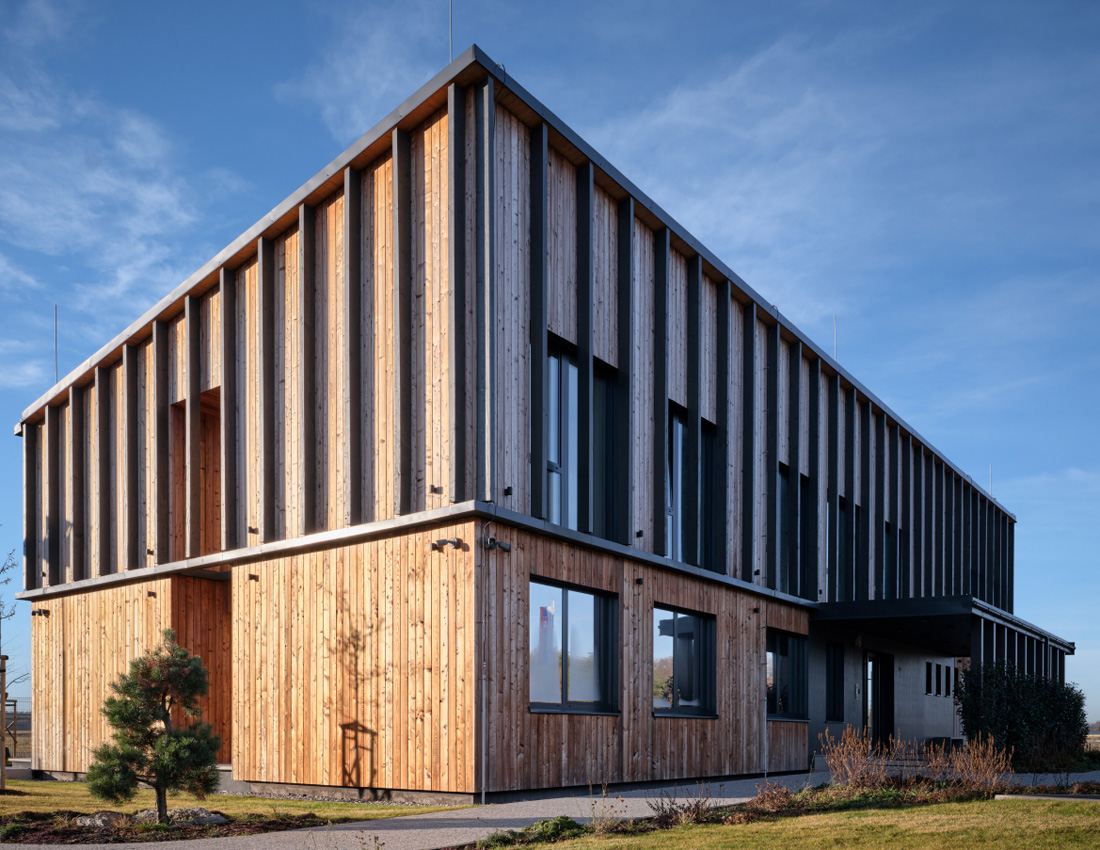 Vystupujúca vetraná fasáda administratívnej budovy Vojenských lesov a majetku Slovenskej republiky s dreveným obkladom je skombinovaná s antracitovými Hardie® Panelmi pri vchode.
