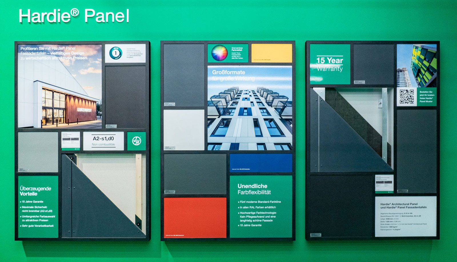 S fasádnym obkladom Hardie® Panel tak majú architekti, projektanti a investori možnosť dokonale zjednotiť dizajn prevetrávanej fasády s balkónovým zábradlím. Nebráni im v tom ani farebnosť - okrem šiestich nadčasových štandardných farieb je možné vytvoriť špeciálne odtiene podľa individuálnych požiadaviek zákazníka.