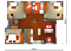 Nový dům Veritas představuje elegantní řešení čtyřpokojového domu se vstupem z čelní strany, který je určen zejména pro užší pozemky. Opravdové srdce dřevostavby je tvořeno velkorysým obývacím pokojem s kuchyní, místem pro stolování a výhodně umístěnými krbovými kamny. Velké pokoje v rozích rodinného domu poskytují svým obyvatelům dostatek prostoru a zároveň potřebné soukromí. Nespornou výhodou nového bungalovu Veritas je také částečně zastřešená terasa, lákající k odpočinku a grilování s přáteli. Dům s dispozicí 4+kk a podlahovou plochou 104 m2 pořídíte bez základové desky na klíč v základní třídě jakosti „pozdní sběr“ za atraktivní cenu 2.350.000,-Kč (vč. DPH).