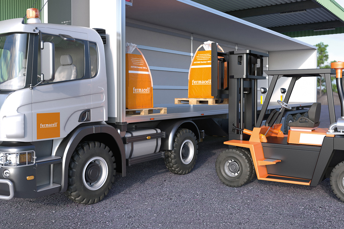 3. Big bagy naplní nemiešanými odrezkami sadrovláknitých dosiek fermacell® a podlahových prvkov fermacell®. Aby sa zabránilo naplneniu cudzorodými látkami, ako sú farby, laky, lepidlá, obaly, fólie, izolácia alebo stavebná suť, odporúča sa veľkoobjemové kontajnery oranžovej farby medzi jednotlivými náplňami dočasne utesniť našitými páskami.